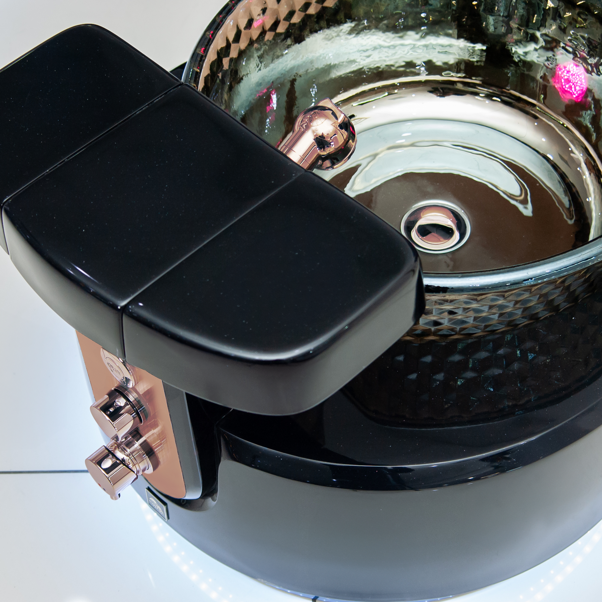 Infuse warmth and elegance into your salon with rose gold-accented accessories. The rose gold front panel, shower head, MagJet™ Head Set, and drain stopper add a soft yet opulent glow, creating a refined and modern ambiance.