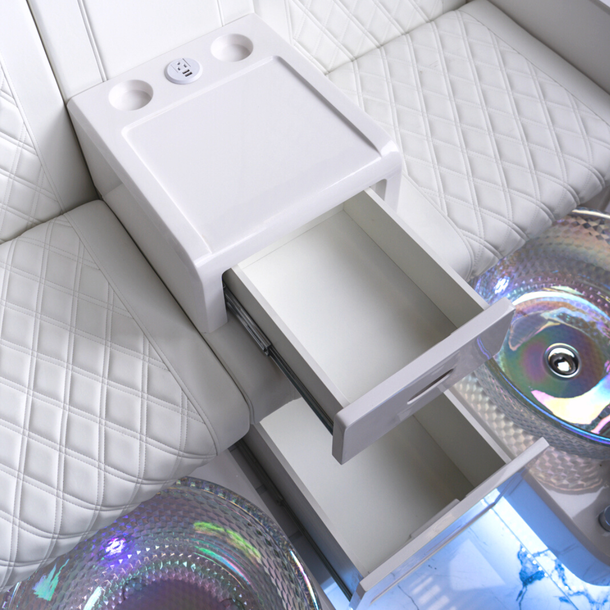 The center console is equipped with built-in cup holders, USB and AC outlets. No more low battery anxiety. Comes with 2 pull-out drawers for extra storage.