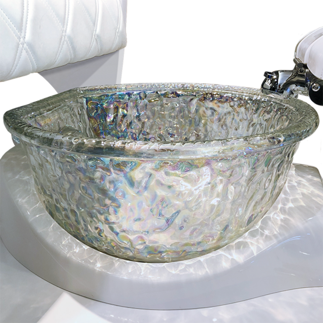 Crystal-glass basin with iridescent “mother of pearl” finished surface; basin is durable, thermal shock resistant, LED lit and compatible with spa liners. The platform is gorgeously designed with LED-accent lighting along the sides that will also light up the floor.